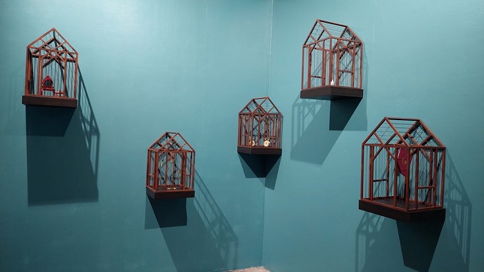 Ο εκθεσιακός χώρος μετασχηματίζεται σε μια site-specific εγκατάσταση που λειτουργεί μεταφορικά ως κλωβός, μέσα στον οποίο αναπτύσσεται μια σειρά από περίτεχνα κλουβιά. Στο εσωτερικό τους, η καλλιτέχνις εγκλείει αντικείμενα που λειτουργούν ως σύμβολα κοινωνικά κατασκευασμένων ρόλων και προσδοκιών: παιχνίδια που παραδοσιακά απευθύνονται σε κορίτσια και υποδηλώνουν μια πρώιμη προετοιμασία για την οικιακότητα και τη μητρότητα, μαζί με ρολόγια, κλειδιά και ταυτότητες. Τα στοιχεία αυτά αναδεικνύουν την εμμονή στερεοτύπων που ορίζουν και περιορίζουν την αντιληπτή φύση της γυναίκας. Περιμετρικά της εγκατάστασης αναπτύσσεται μια χειροποίητη ταπετσαρία που παραπέμπει σε άλλες εποχές, με κλασικά φυτικά μοτίβα μέσα στα οποία ενσωματώνονται κρυμμένα μάτια—σιωπηλοί παρατηρητές που υποδηλώνουν μια συνθήκη διαρκούς επιτήρησης, ενισχύοντας το αίσθημα ελέγχου και περιορισμού.