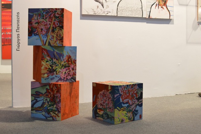 Λίγες ώρες αργότερα την προσοχή μας προσέλκυσε μια κινητικότητα περίπτερο της γκαλερί Παπατζίκου. Βρεθήκαμε πάλι μπροστά στο Γιώργο Πανταζή. Ο νεαρός καλλιτέχνης παρουσίαζε μια εντυπωσιακή ζωγραφική performance. Παρουσία επισκεπτών ζωγράφιζε σε τέσσερις κύβους «παραδίδοντας» λίγο αργότερα στο κοινό το ζωγραφικό αποτέλεσμα.