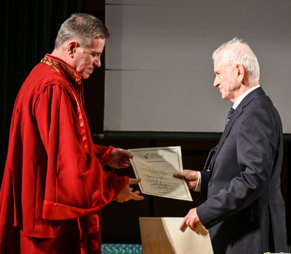 Ο Πρύτανης του ΔΙΠΑΕ, Σταμάτης Αγγελόπουλος απονέμει τον τίτλο του επίτιμου διδάκτορα στο Στέφανο Δασκαλάκη