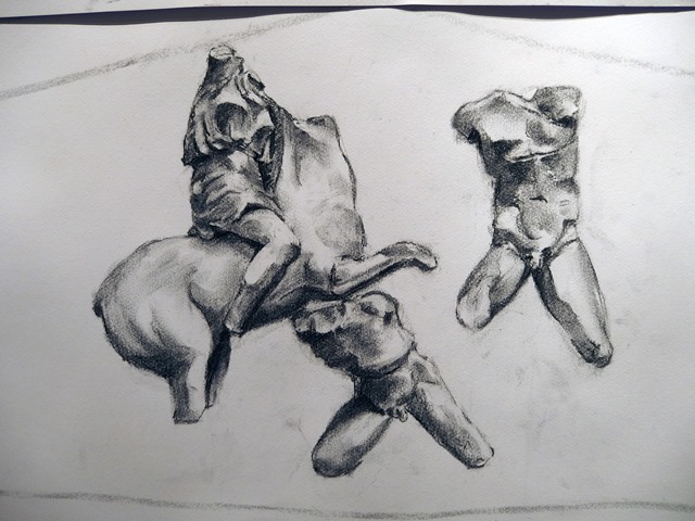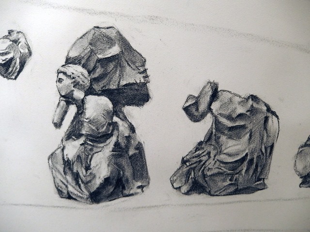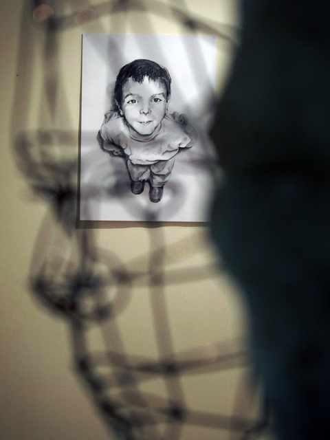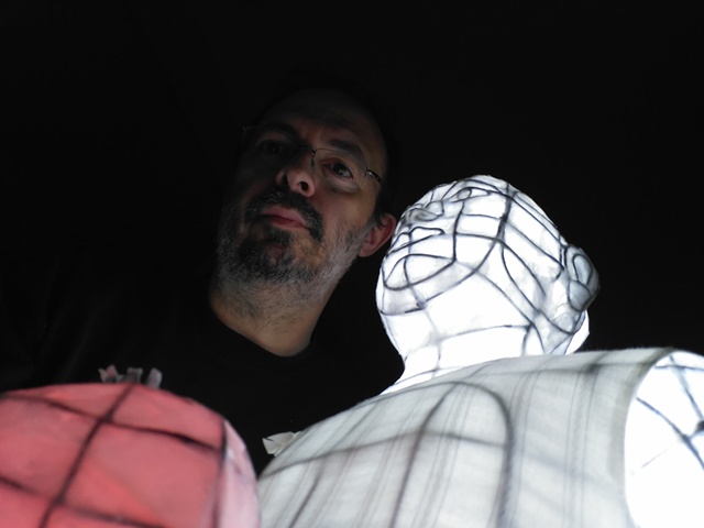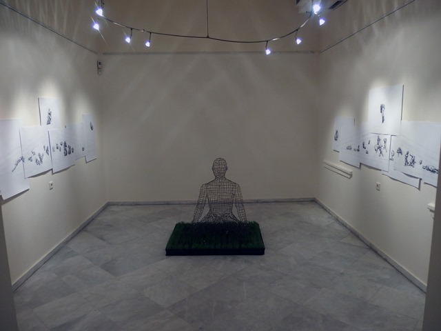 - Στον τρίτο χρόνο, «στο εντός» ο πρωταγωνιστής της ιστορίας, σε στάση »ζεν». Μια φιγούρα συρμάτινη με led που περιβάλλεται από ασπρόμαυρα σχέδια γλυπτών από τον ναό του Ασκληπιού στην Επίδαυρο. Ποιός ο συμβολισμός τους;