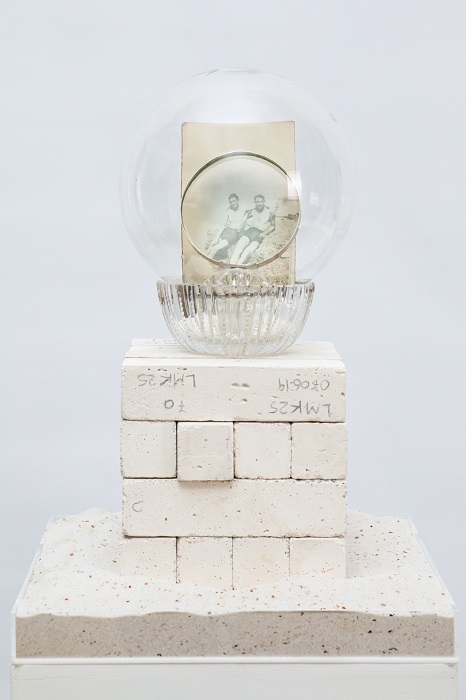 Γοργόνοι, 2026, φωτογραφία, γυάλα, μεγεθυντικός φακός, τριμμένο κοράλλι, δοκίμια αντοχής κονιάματος, 30 x 40 x 30 ε