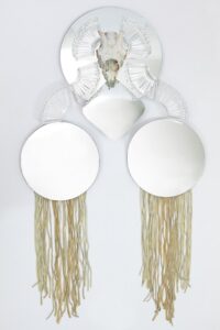 3 Τρόπαιο, 2026, καθρέπτες, κρανίο ζώου, κρυστάλλινα πιατάκι, δερμάτινα κορδόνια, 70 x 125 x 20 εκ