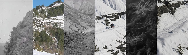 Γιάννης Ζιώγας. Η predella του Γράμμου ως Παγωμένου Χρόνου (λεπτομέρεια), 2021-2023, Ακουαρέλα σε χαρτί και φωτογραφικό κολάζ,100 x 180 εκ.