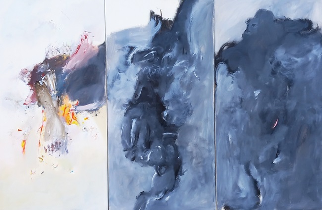 Νίκος Κρυωνίδης, Ολοκαύτωμα στο Χορτιάτη (2/9/1944), 2023, Ακρυλικό σε μουσαμά, Τρίπτυχο, Συνολικά 140 Χ 210 εκ.