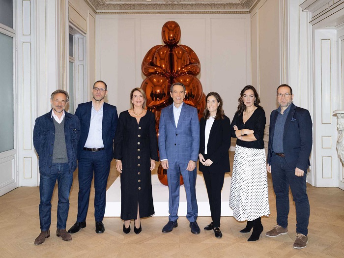 Αριστερά προς δεξιά: Φωκίων Ποταμιάνος (Μέλος ΔΣ και Ταμίας Sonnabend Collection Foundation), Πάνος Ιωσήφ (Επιστημονικός Διευθυντής ΜΚΤ), Σάντρα Μαρινοπούλου (Πρόεδρος και Διευθύνουσα Σύμβουλος του Μουσείου Κυκλαδικής Τέχνης), Jeff Koons, Αφροδίτη Γκόνου (Σύμβουλος Προγράμματος Σύγχρονης Τέχνης ΜΚΤ), Τιτίνα Πατέρα (Aντιπρόεδρος Β’ ΜΚΤ), Ιωάννης Φάππας (Επιστημονικός Διευθυντής ΜΚΤ) Φωτoγραφία: Πάρις Ταβιτιάν © Μουσείο Κυκλαδικής Τέχνης